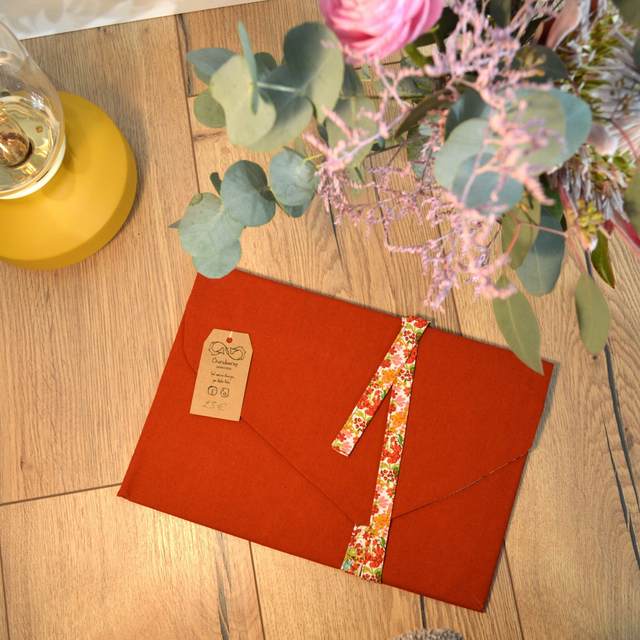 Protège livre en coton de format médium, idéal pour transporter son livre du moment partout avec soit sans s'inquiéter de l'abimer. Largeur 28cm hauteur fermer 19cm. Système de fermeture par lien et pan de fermeture asymétrique.
